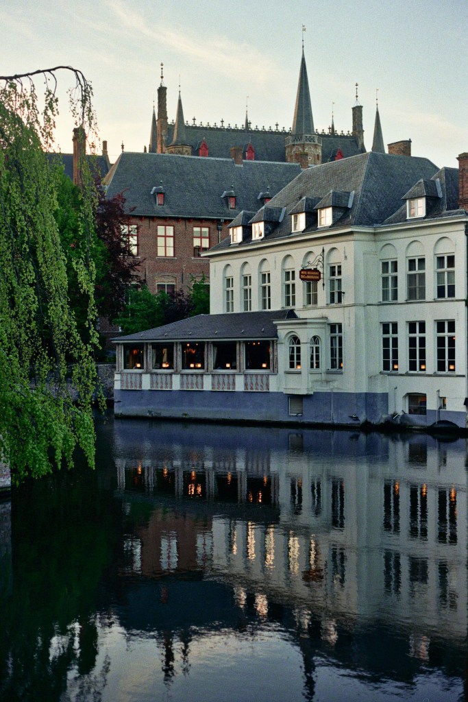 It is hours still until the first boats will throng through these canals, and so Bruges is wrapped in silver ribbons, criss-crossed in smooth, unshattered mirrors. Peering in to see their faces are all the gabled houses lining the banks, dressed in plum, cherry and burnt brick. Early morning sun, fresh and clean, pours itself into their red-framed windows.
