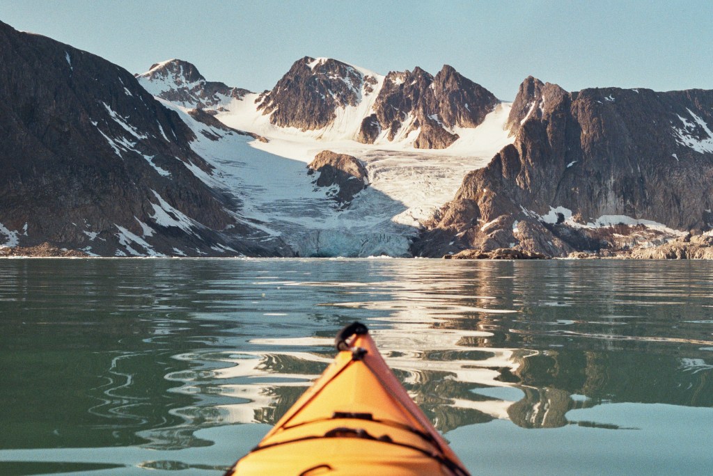 My kayak glides quietly across the waters of the bay. The sky is completely cloudless, a rare occurrence here in Svalbard, and the bay is so calm we could be rowing across a burnished silver plate. All around us rise the snow-clad mountains, bathing in the cool water. The summer heat undresses them, until their limbs are draped only in white ribbons.
